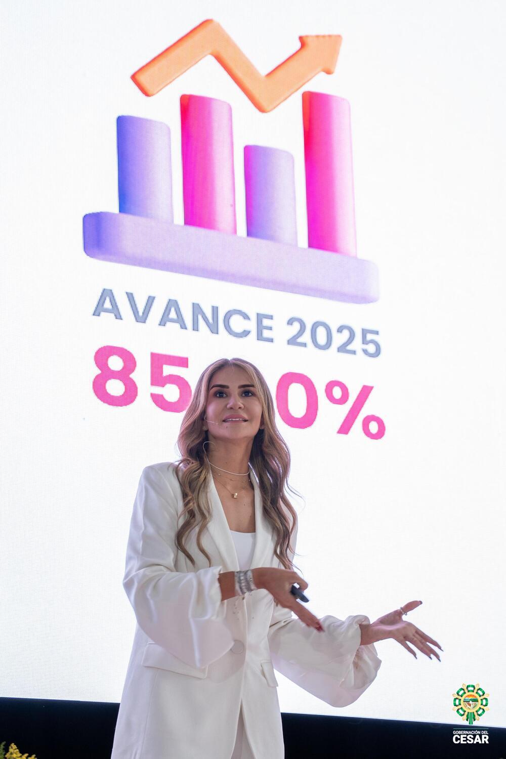 La gobernadora Sanjuan Dávila afirmó que, para la vigencia 2025 se ha cumplido con el 85% de las metas propuestas en el Plan de Desarrollo, con una inversión de 1,5 billones de pesos, impactando especialmente sectores de educación, salud, vías y bienestar social.